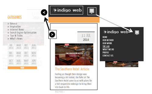 Your run-of-the-mill site structure would be similar to what’s pictured below – banner with logo and navigation, a large image or perhaps a content slider below that, some further navigation and your body text/content. This content is strategically placed to improve readability and accessibility on large screens. Thus, we have the smartphone dilemma: how do we structure the same information in a manner which is concise, petite and elegant, whilst still being informative and readable?